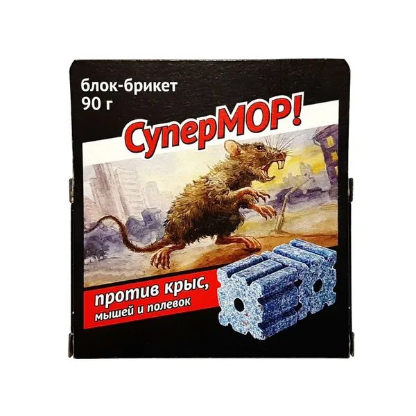 СуперМор – родентицидное средство в форме блока-брикета для борьбы с крысами, мышами и полевками. Средство обладает усиленным действием, так как содержит сразу 2 действующих вещества (бродифакум – 0,003%, зоокумарин – 0,008%). Также СуперМор имеет высокую вкусовую привлекательность для грызунов, снижает чувство опасности. Умершие грызуны мумифицируются и не издают неприятного запаха. Состав: бродифакум – 0,003%, зоокумарин – 0,008%, битрекс, парафин, краситель, масло растительное, сахар, ароматизатор, антиоксидант, пищевые наполнители (мука, зерно, отруби, крупы).